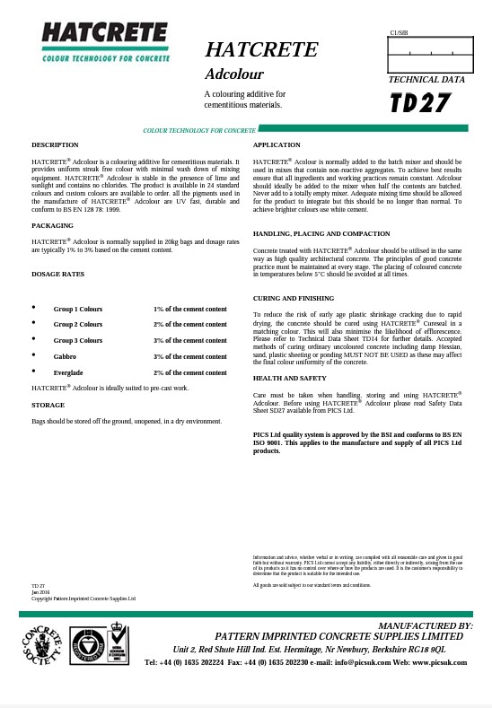 Certified Quality and Durability: HATCRETE Adcolour is more than just color – it’s quality. All pigments used in its manufacturing are UV stable, durable, and compliant with BS EN 12878:1999 standards. This guarantees not only breathtaking color but also the longevity and durability your projects deserve.